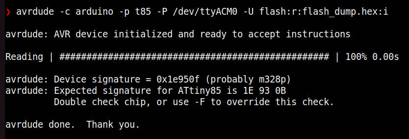 بعدش که دیجیاسپارک رو بهش وصل کردم و با avrdude خواستم ازش دامپ بگیرم، avrdude داره m328p رو میبینه که همون آردوینو هست و دیجیاسپارک رو نمیبینه. (طبق تصویر زیر)